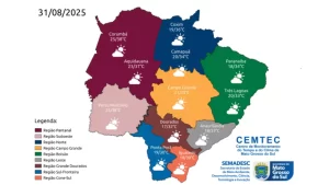 Para as regiões sul, cone-sul e Grande Dourados, são esperadas temperaturas mínimas em torno de 17°C e máximas de 32°C. No sudoeste e Pantanal, os termômetros devem oscilar entre 23°C e 38°C. Já no bolsão, leste e norte do estado, as mínimas ficam próximas de 18°C e as máximas chegam a 36°C.