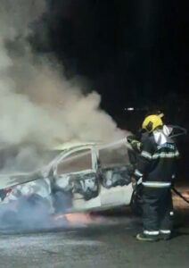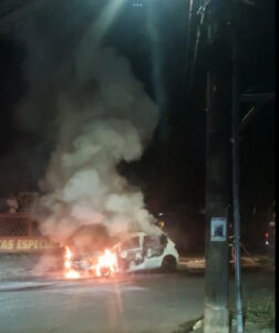 Um veículo VW Gol ficou completamente destruído após pegar fogo, na noite desta quinta-feira (4), na Avenida Manoel Joaquim de Moraes, no bairro Jardim Leblon, em Campo Grande.