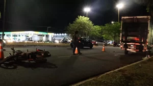 Garupa de moto fica ferida após cair embaixo de caminhão na Cônsul Assaf Trad