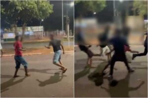Imagens registradas mostram agressões físicas, com socos e empurrões, e alguns participantes usando uniformes escolares. A Polícia Militar foi acionada e mantém equipes no local, monitorando a área para prevenir novos confrontos.