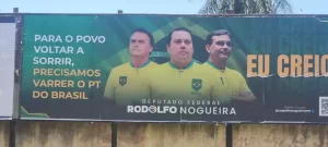 A peça publicitária está localizada na Rua Major Capilé, em área de grande fluxo de pessoas e veículos. No material, o parlamentar aparece ao centro, entre o ex-presidente Jair Bolsonaro (PL) e o senador Flávio Bolsonaro (PL), vestindo camisa da Seleção Brasileira, ao lado da frase: “Para o povo voltar a sorrir, precisamos varrer o PT do Brasil”. O outdoor também exibe a logomarca e as redes sociais de Nogueira.