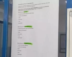 O comunicado afixado na secretaria da unidade informa que, todos os anos, a prefeitura fornece kits de material escolar aos alunos e que o benefício será mantido neste ano. No entanto, como os materiais ainda não foram entregues, a direção solicita que os pais que tiverem condições adquiram os itens necessários para o início das aulas.