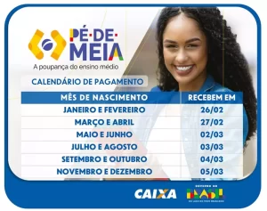 A Caixa Econômica Federal iniciou o pagamento das parcelas do Programa Pé-de-Meia, política do Governo Federal voltada ao incentivo da permanência e da conclusão do Ensino Médio. Neste calendário, cerca de 3,1 milhões de estudantes recebem os valores referentes ao Incentivo Conclusão, de R$ 1.000, e ao Incentivo Enem, no valor adicional de R$ 200.