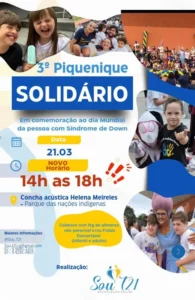 A Associação SOU T21 promove, neste sábado (21), o 3º Piquenique Solidário em Campo Grande, em alusão ao Dia Mundial da Síndrome de Down. O evento será realizado a partir das 16h, na Concha Acústica Helena Meirelles, com entrada gratuita e aberta ao público.
