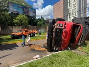 Um caminhão carregado de terra tombou no início da tarde desta segunda-feira (6), na rotatória entre a Avenida Mato Grosso e a Avenida Nelly Martins (Via Park), em Campo Grande.