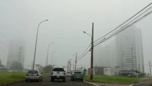 A Terça-feira (28) amanheceu com forte presença de neblina em diferentes regiões de Campo Grande, cenário bem diferente dos últimos dias de clima seco. Durante a madrugada, a umidade relativa do ar atingiu 94%, conforme dados do Instituto Nacional de Meteorologia, permanecendo elevada até por volta das 5h.